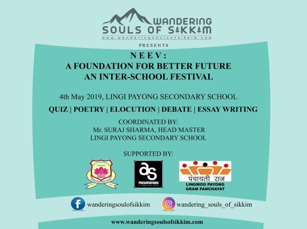 Wandering Souls of Sikkim organised it's inter school festival, NEEV : A Foundation for better future at Government Senior Secondary School, Rateypani, South Sikkim on 4th October 2019. https://www.facebook.com/wanderingsoulofsikkim/photos/pcb.2521794134579562/2521777584581217/?type=3&theater The festival comprising of plethora of scholastic activities such as quiz,essay writing, elocution,poem recitation and debate was graced by Education Secretary M.T Sherpa as the Chief... Continue Reading →